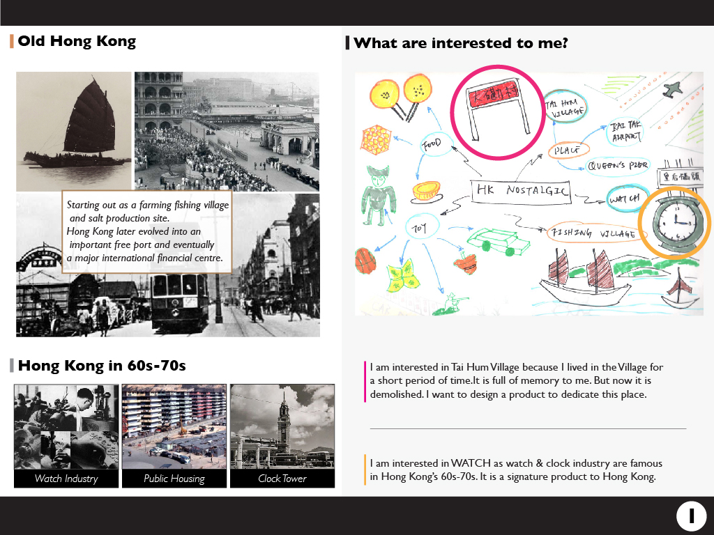 Watch was a signature product during the 1960s in Hong Kong. At that period, Tai Hum Village was the largest settle area in Hong Kong where I lived there for my whole childhood. As both watch and Tai Hum Village are meaningful to Hong Kong people, I combine these two elements for my design.