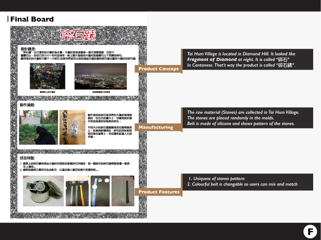 How is your past? Design for old Hong Kong is my undergraduate design and marketing group project. Every group has to choose one element to design a product related to old Hong Kong. The theme of the project has recalled my old days in Tai Hum Village which was already demolished. Hence, I used the stones that left in the original location of Tai Hum Village to design a watch to keep the memory of the village. I hope this product can bring a collective memory for those people who have experienced their lives in Tai Hum Village.