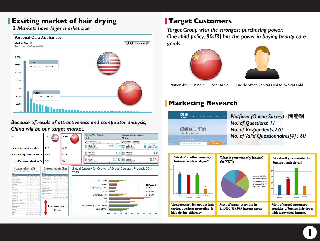 Research was needed to find target market. Attractive analysis and competitor analysis were used to decide China as the target market. For marketing approach, heterogeneous product was designed as it was a popular trend. People from age 25 to 34 had higher purchasing power who were target customers.