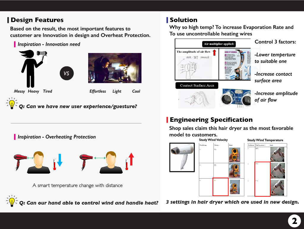Which small household appliance do you use the most? Hair dryer is the one that I use the most. It is also the one that bothers me the most because two hands are needed to dry my hair at the same time. I tried to solve this problem in my final year project. The design was inspired by my personal experience, the scene of classic movie and my curiosity in exploring the new way of using the hair dryer. Moreover, this hair dryer is a low thermal hair dryer with automatic temperature adjustment which is market driven and innovative.