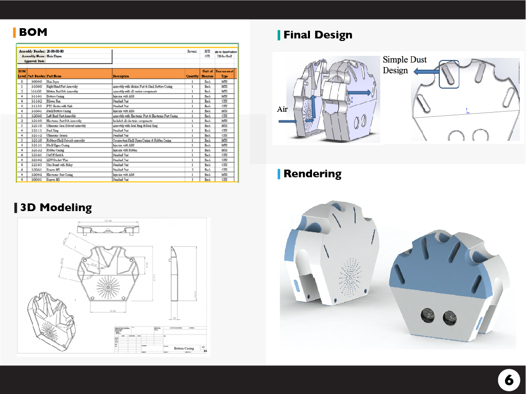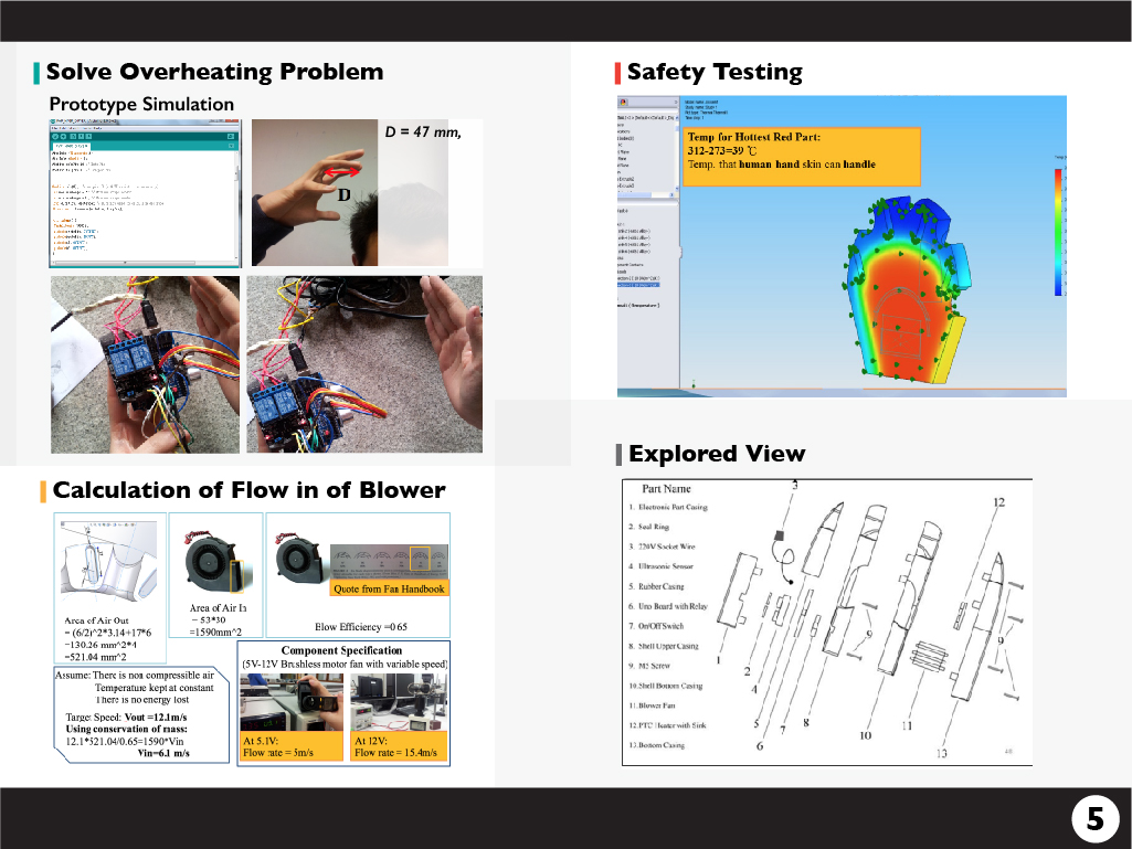 Ultrasonic sensor was used for automatic temperature adjustment. And the safety testing was about testing thickness of material required for handling heat problem. Exploded view is shown.