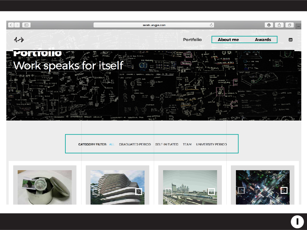 For digital CV, “About Me” and “Award “are shown in main navigation. To search for self-initiated projects in easier way, categories filters are added. Extra information about the project are shown in the right-handed side of my portfolio content.