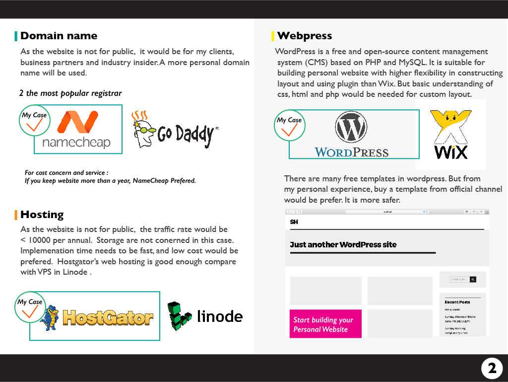 Domain, hosting and web design platform are needed to choose for my portfolio. When I concern about the time for implementation, storage needed, server permission and cost, Hostgator and WordPress are used in this project.