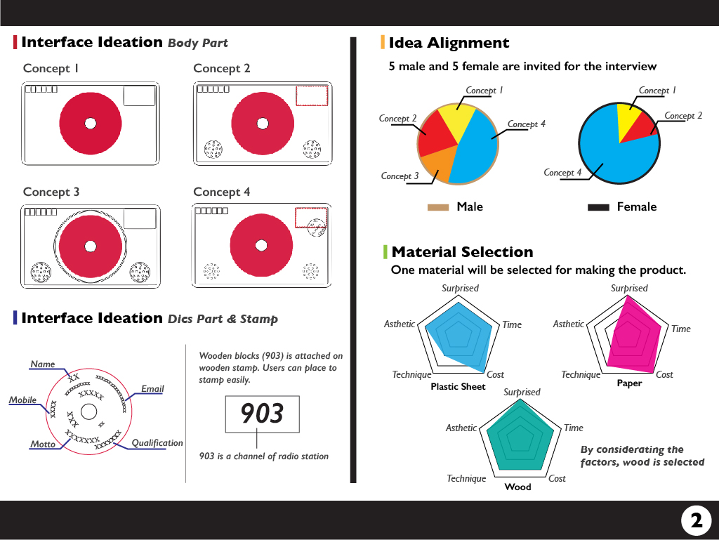 I design some interfaces with the elements of postcard and disc player. 10 friends, who loved listening to radio were invited to give some comments on interfaces. As the product would be sent to a team of DJs with different genders. The survey was conducted by gender groups.