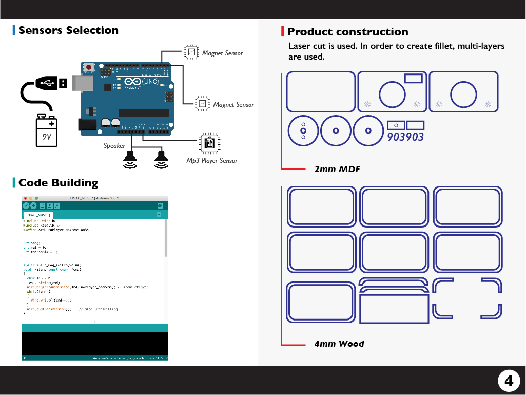 The product is constructed by three main parts: sensor, electronic components, laser cut parts and codes.